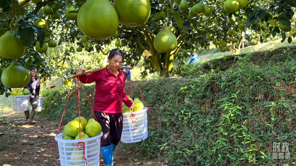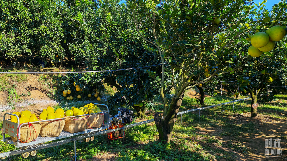 △金柚采摘运送用上了无人轨道车,可十分大程度上减轻人力担负。(总台央视记者郭鸿拍照)